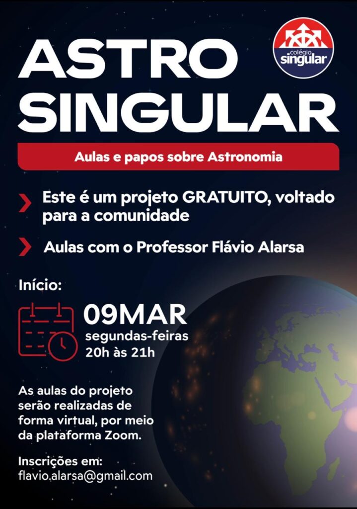 Com o propósito de aproximar a ciência da comunidade e ampliar a consciência sobre a preservação do planeta, o Colégio Singular, com unidades localizadas no Grande ABC, lança o Projeto Astro Singular, uma iniciativa de divulgação científica idealizada e conduzida pelo professor Flávio Alarsa (Física). O projeto oferece aulas semanais de Astronomia, totalmente gratuitas e abertas à população. O início está previsto para o dia 9 de março (segunda-feira).